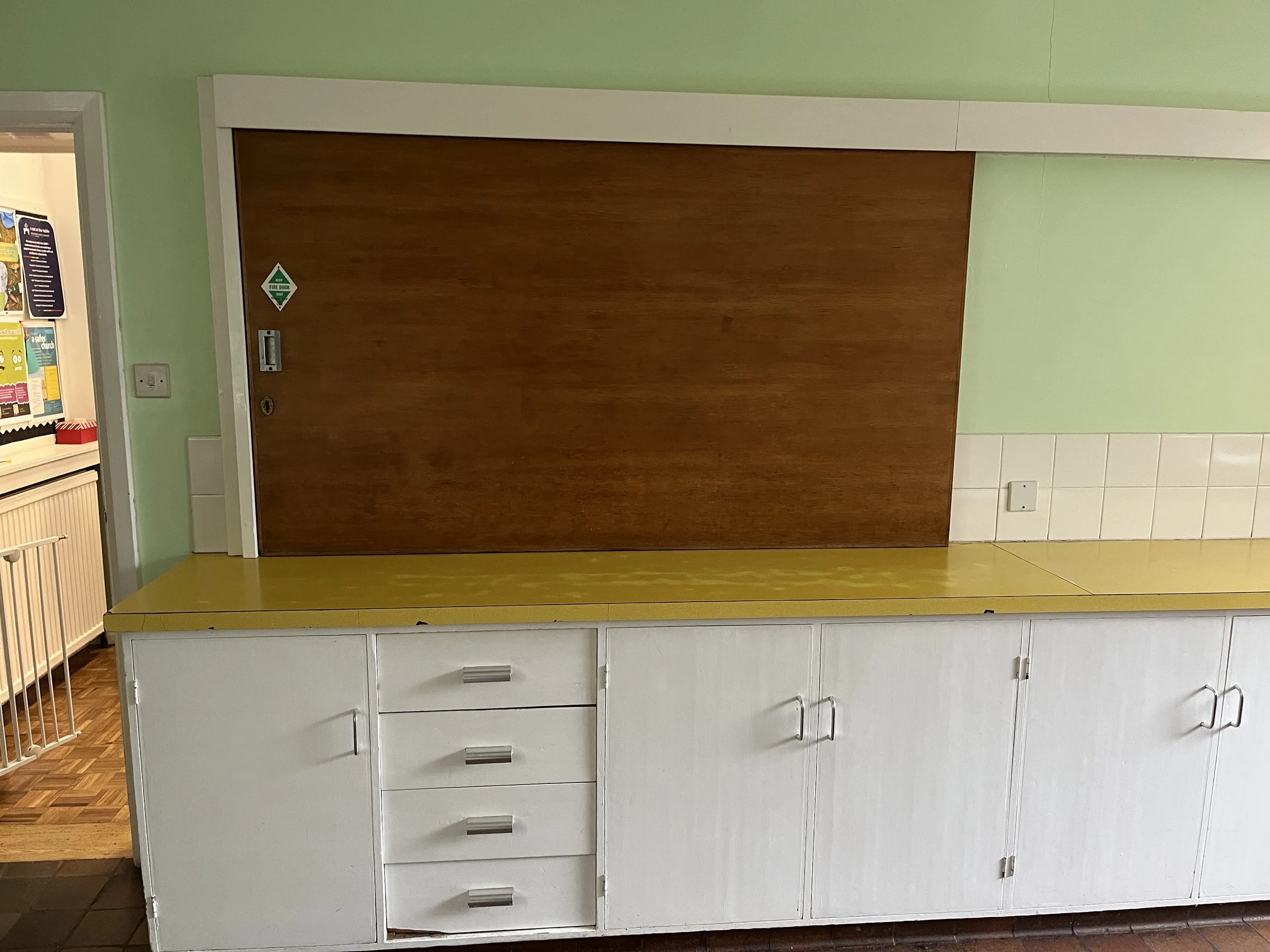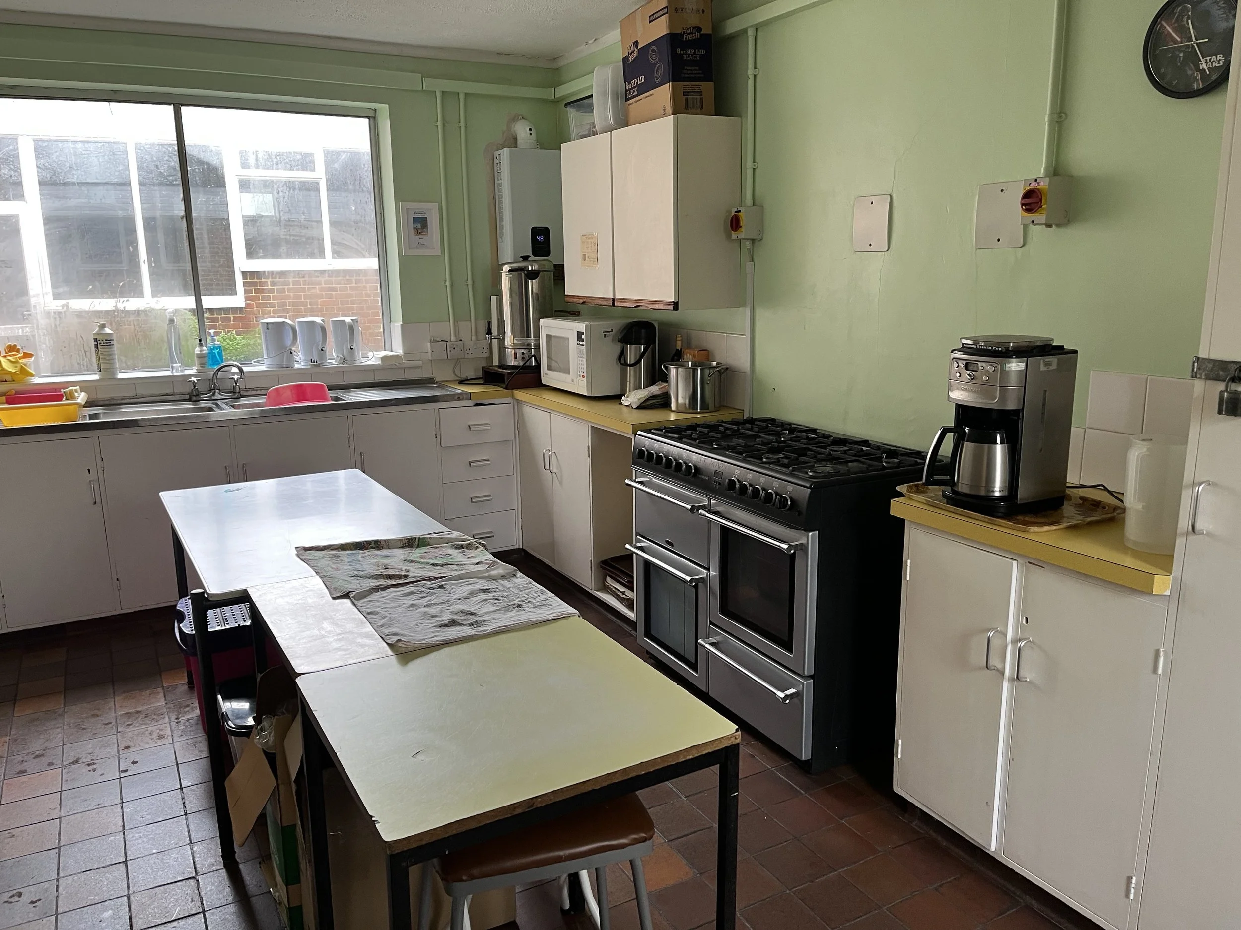 The kitchen is designed to support events serving larger groups and connects directly to the hall through a serving hatch.
