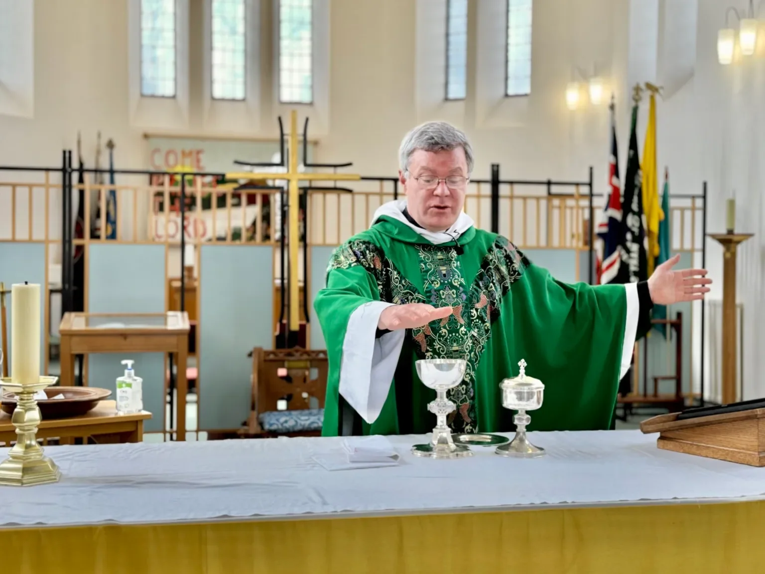 Children are also welcome to receive communion if they are used to doing so, or if not, they can have a blessing. You will then return to your seat, and there will be some music playing. You may sing along with the words on the screen if you wish.