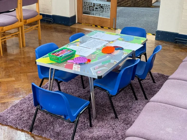 There is a small table with some colouring and activities on, for young children, which you can use if you wish. There are toilets in the adjoining hall, and a disabled accessible toilet just through a set of glass doors. A church member will show you where they are, if you ask.